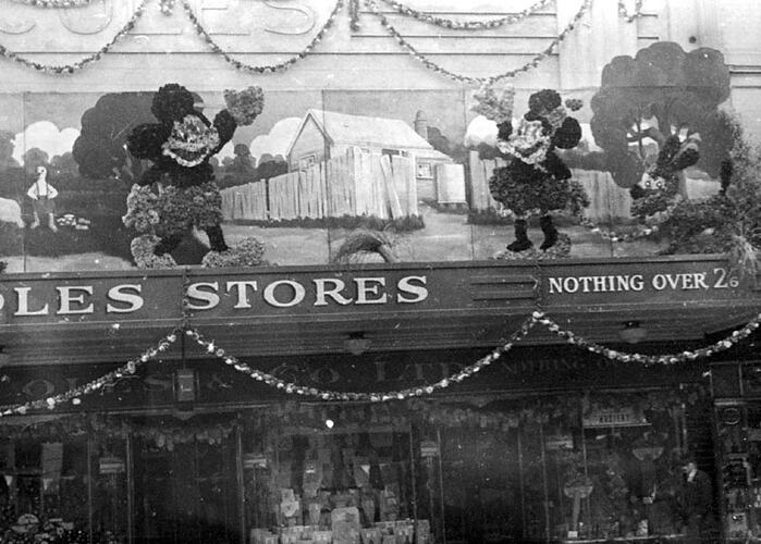 A Coles department store decorated with a mural of Mickey Mouse and Minnie Mouse. Part of the celebrations for Ballarat Gala Day.