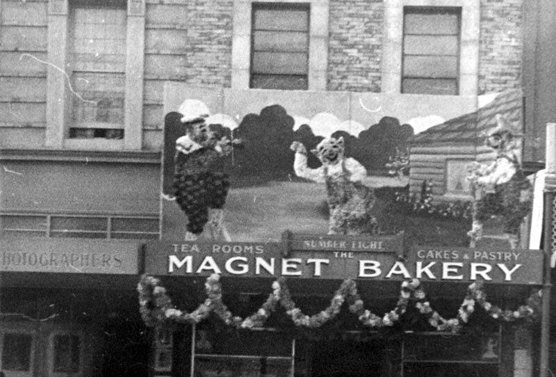 Decorated shop fronts. The 'Magnet Bakery' displays the three little pigs. Part of the celebrations for Ballarat Gala Day.