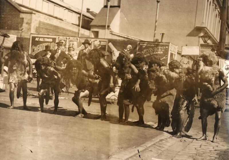 Black and white image of a group of people dressed up as cavemen for a street parade.