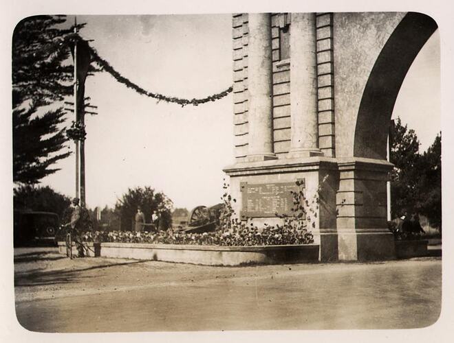 Cannons, Celebrations, Commemorative Arches, Decorations, Flowers, Motor Cars, Parades, Public Gardens, War Memorials