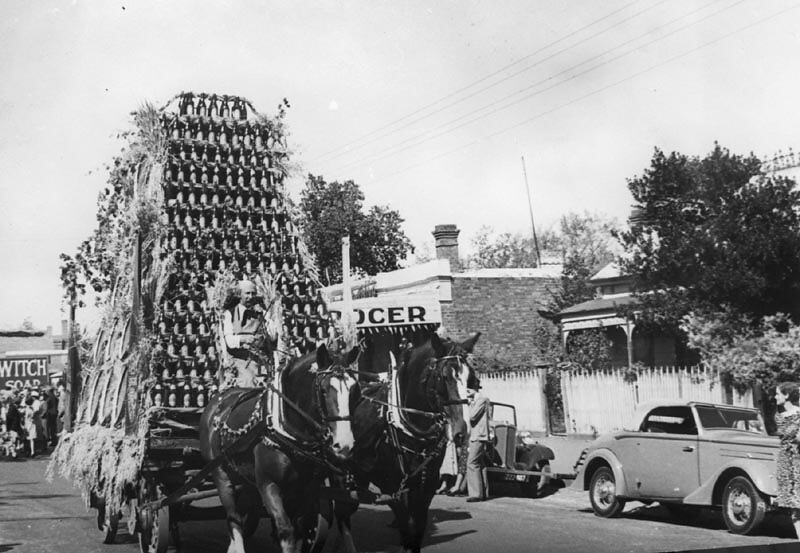 A horse-drawn parade float featuring a large number of beer bottles. Part of the celebrations for Ballarat Gala Day.