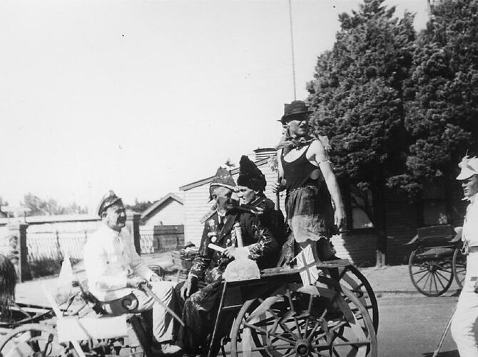 Men in fancy dress riding in a cart in a parade. Part of the celebrations for Ballarat Gala Day.