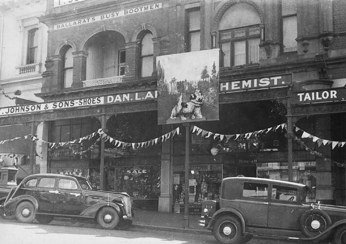 A floral, black and white, puppy above the awning of 'Dan L. Akeland, Chemist'. Part of the celebrations for Ballarat Gala Day.