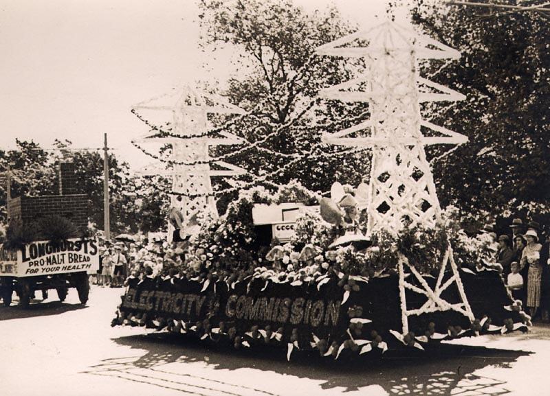 The Electricity Commission float & Longhurst 's Pro-Malt Bread . The electricity commission float features pylons and power lines. Part of the celebrations for Ballarat Gala Day.