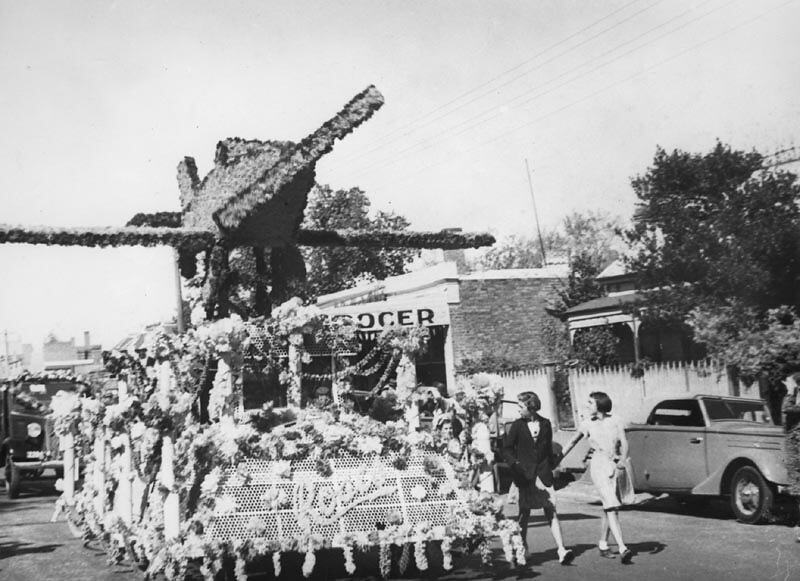 Advertising, Aeroplanes, Celebrations, Decorations, Flowers, Motor Cars, Parade Floats, Parades, Roads