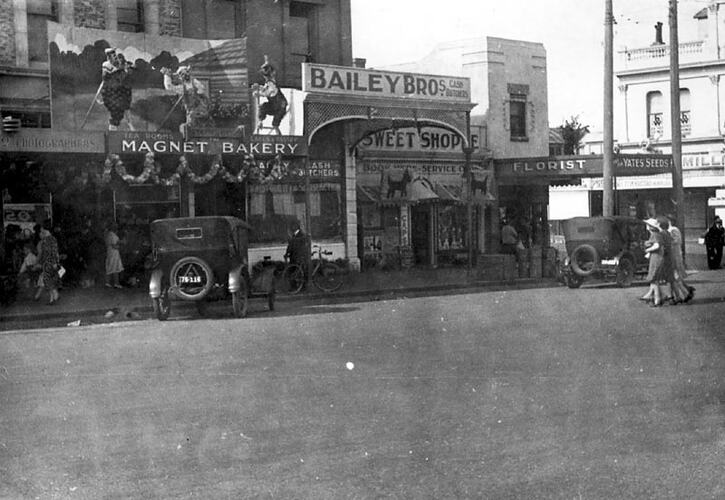 Bakeries, Bicycles, Butchers, Celebrations, Decorations, Florists, Motor Cars, Parades, Roads, Shops