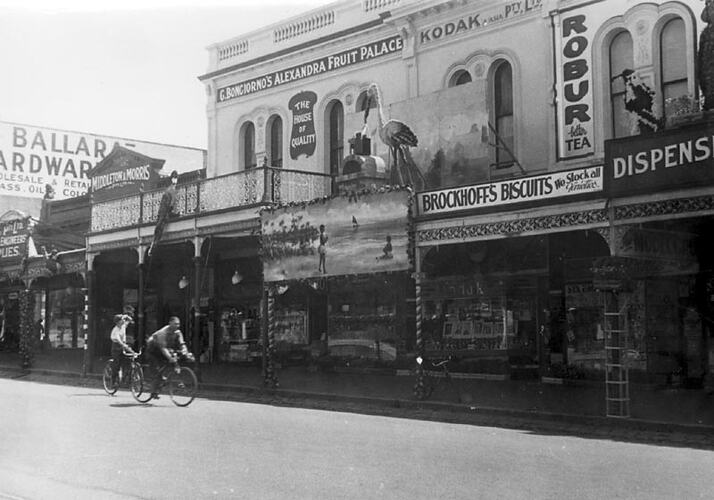 Two people cycling past decorated shop fronts. Part of the celebrations for Ballarat Gala Day.