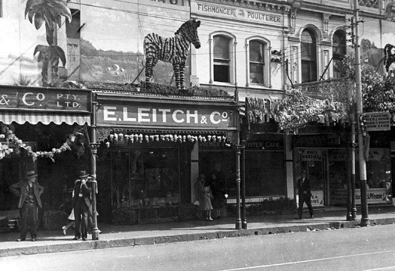 Decorated shopfronts. 'A. Leitch & Co.' has a zebra on the awning while the fishmonger next door has a fish displayed. Part of the celebrations for Ballarat Gala Day.