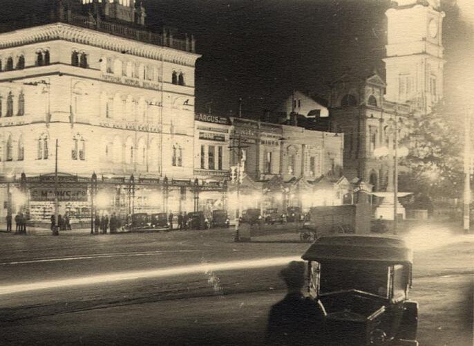 Decorated shop fronts features 'National Mutual Building' by night. The Town Hall is on the right and there is a car in the foreground. Part of the celebrations for Ballarat Gala Day.