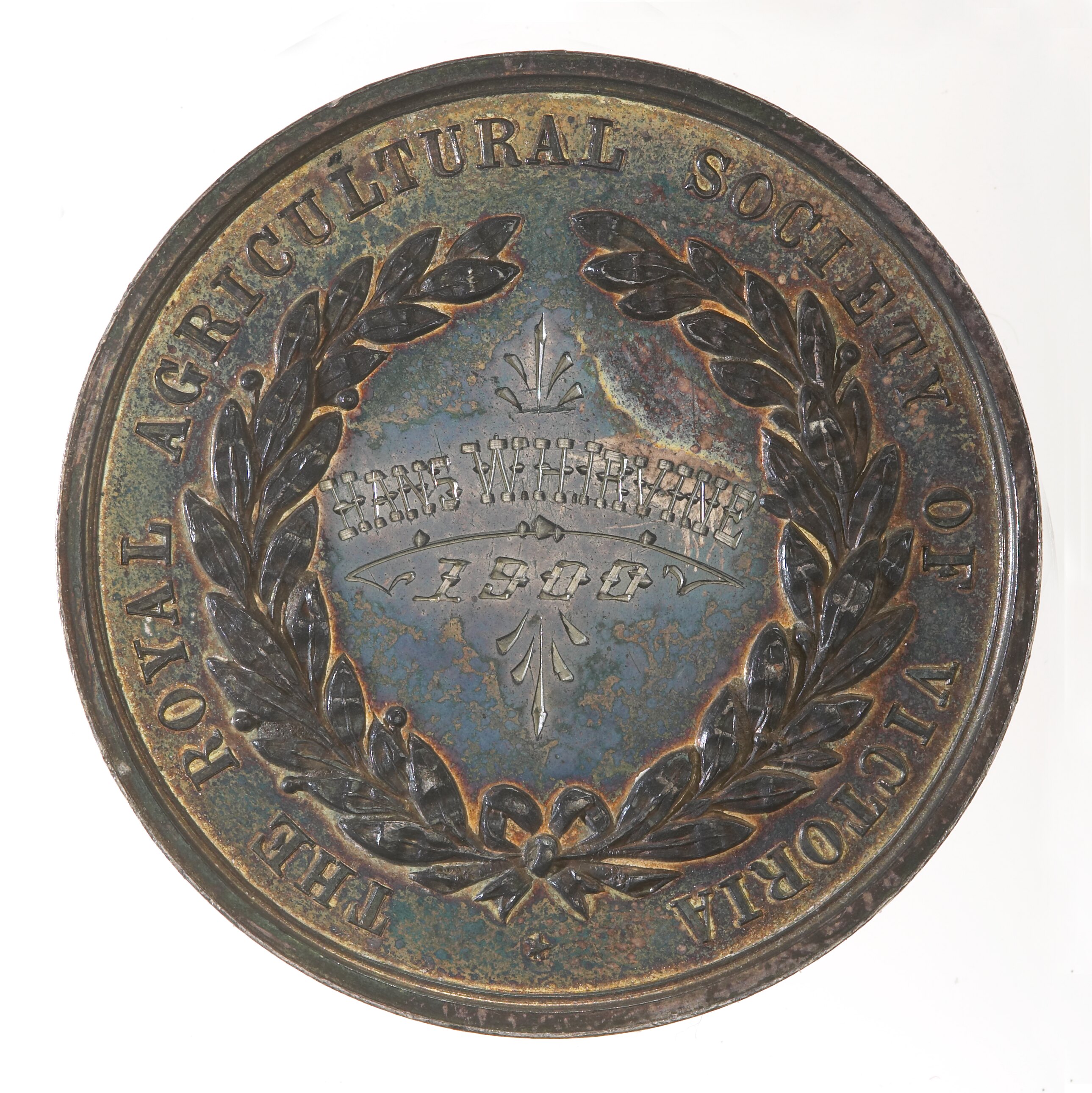 At centre inscribed within an olive wreath, HANS W.H. IRVINE / 1900 ; around, THE ROYAL AGRICULTURAL SOCIETY OF VICTORIA