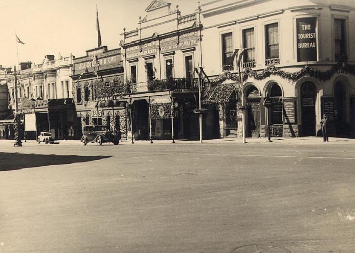 Celebrations, Decorations, Flags, Government Departments, Hairdressers, Motor Cars, Parades, Roads, Shops, Verandahs