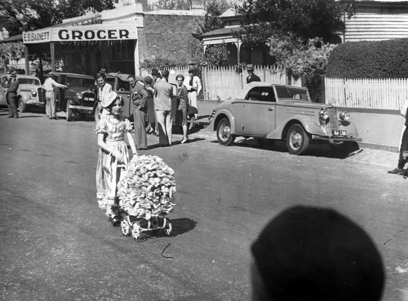 Celebrations, Fancy Dress Costumes, Grocers, Motor Cars, Parades, Picket Fences, Prams, Shops, Spectators