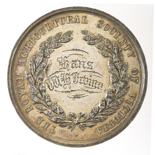 At centre inscribed within an olive wreath, HANS W.H.IRVINE; around, THE ROYAL AGRICULTURAL SOCIETY OF VICTORIA