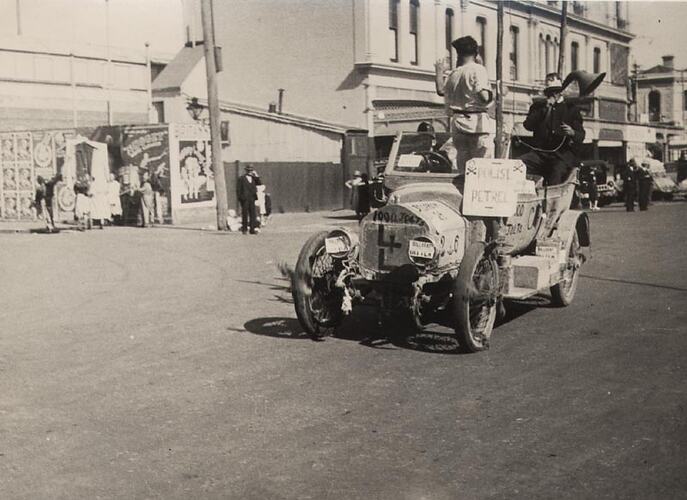 A humorous float deriding police. Signs on the car read '1000 volts 4 l' and'Polise Petrel'. Part of the celebrations for Ballarat Gala Day. (see also cn51).