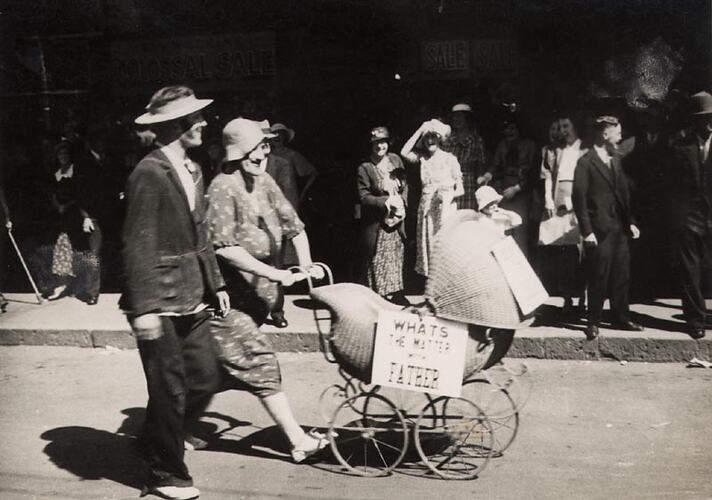 Two men posing as a married couple pushing a pram. A sign on the side reads 'What's the matter with father'. Part of the celebrations for Ballarat Gala Day.