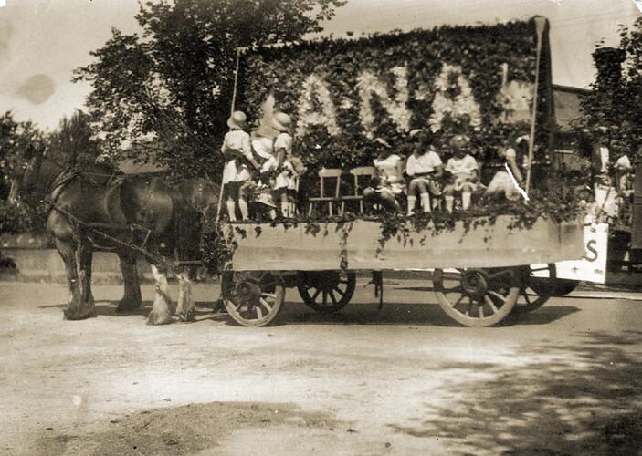 Black and white image of a horse and cart decorated for a street parade. Young children are sitting in the cart.