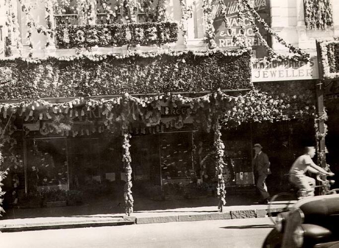 Decorated shop fronts, including 'Humphrey's Jeweller'. Part of the celebrations for Ballarat Gala Day.