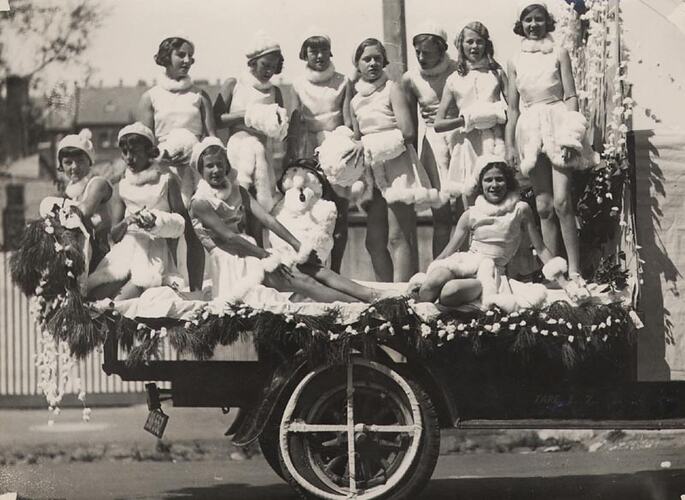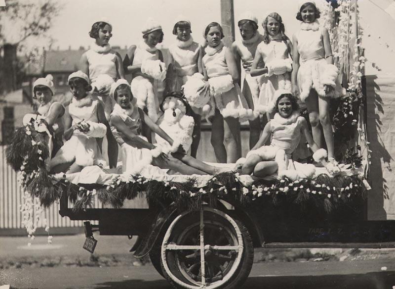 A group of girls on a parade float. They are dressed in short white skirts and all carry muffs. There is a 'snowman' on the float and one girl carries a large'snowball'. Part of the celebrations for Ballarat Gala Day.
