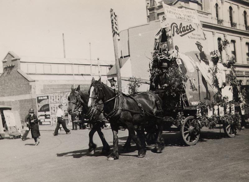 A horse drawn float with 'Pelaco' written on it together with a depiction of the'Pelaco' advertisement depicting Aborigines. Part of the celebrations for Ballarat Gala Day.