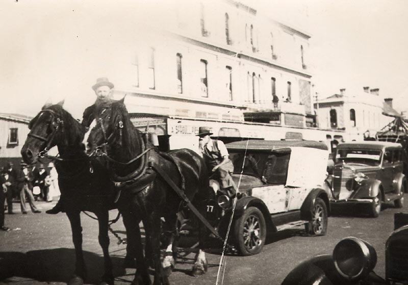 Celebrations, Horsedrawn Vehicles, Horses, Motor Cars, Parades, Roads, Shops