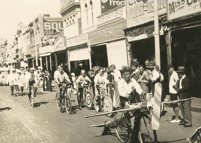 Boys on decorated bicycles, the closest one depicting an aeroplane. One of the shops is 'Gower's Hosiery'. Part of the celebrations for Ballarat Gala Day.