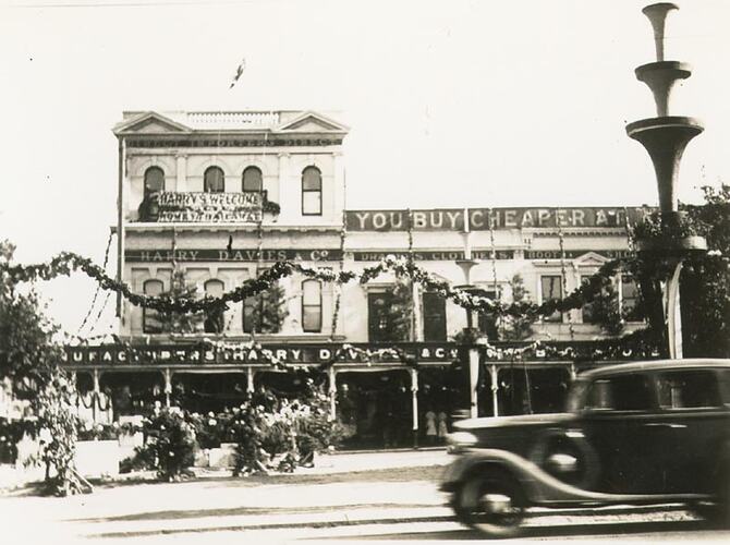 Shopfronts 'Harry Davies & Co' clothing store with decorations. Part of the celebrations for Ballarat Gala Day.