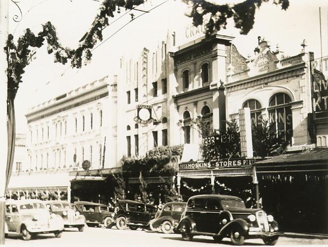 Shop fronts with decorations. 'Hoskins Stores' is in the foreground. Part of the celebrations for Ballarat Gala Day.