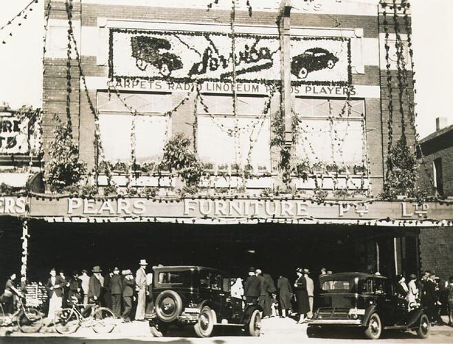 People gathered outside 'Pears Furniture' store to wait for a parade. Part of the celebrations for Ballarat Gala Day.
