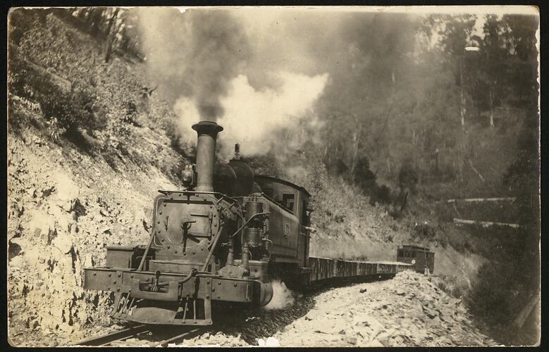 Narrow gauge railway between Moe and Walhalla in Victoria. One of four such line built in Victoria. The steam locomotive is a 2-6-2 NA class of the same type now operating on the Puffing Billy Railway at Gembrook. This is locomotive No. 1A built in 1898 and scrapped in 1929.