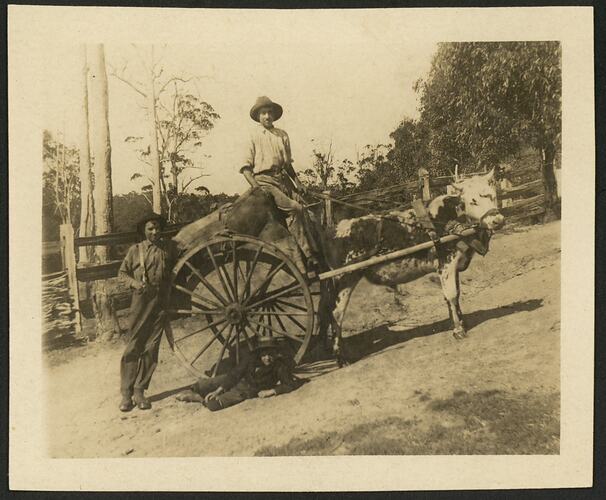 Three boys with a bullock cart standing on a steep up hill road.