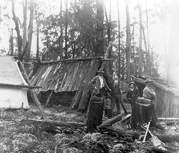 Men outside timber shacks.