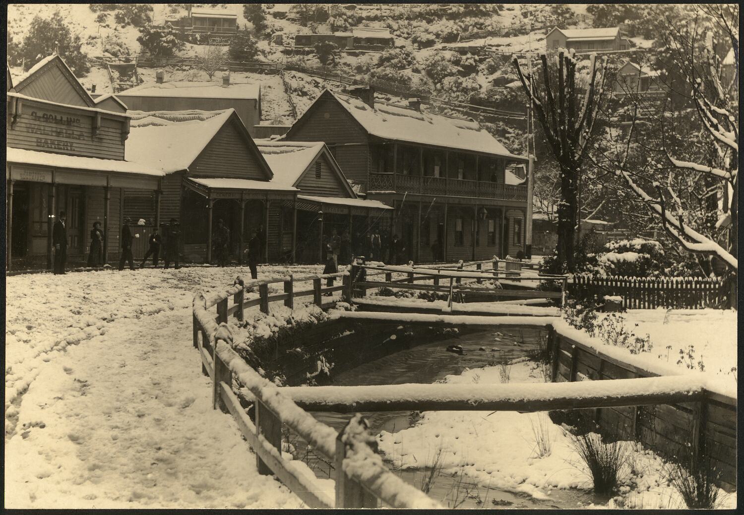 Snow covered buildings and Waterway Bakery, general store, butchery, bootmaker.