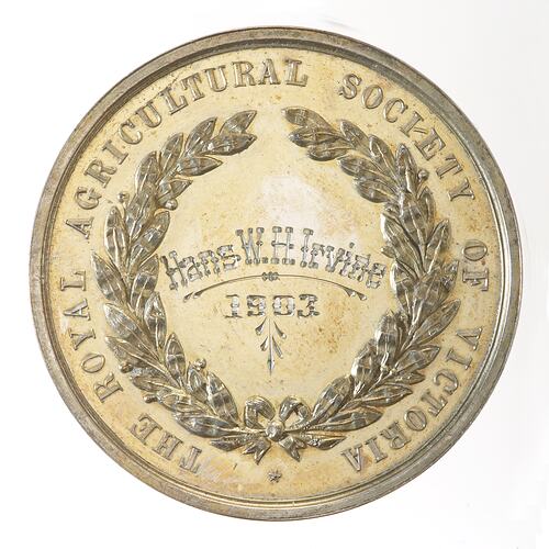 At centre inscribed within an olive wreath, Hans W.H. Irvine / 1903 around, THE ROYAL AGRICULTURAL SOCIETY OF VICTORIA