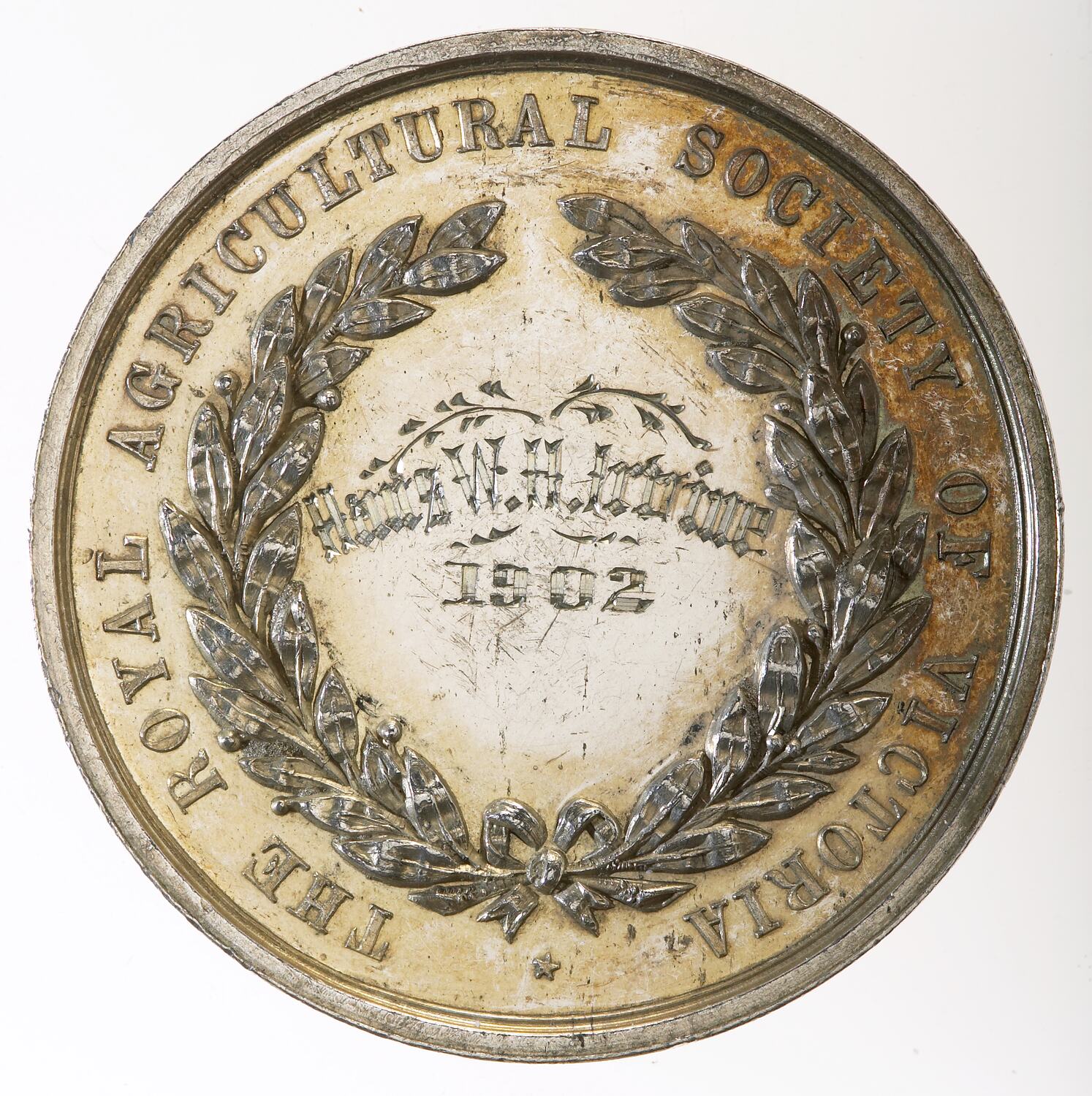 At centre inscribed within an olive wreath, HANS W.H.IRVINE / 1902; around, THE ROYAL AGRICULTURAL SOCIETY OF VICTORIA