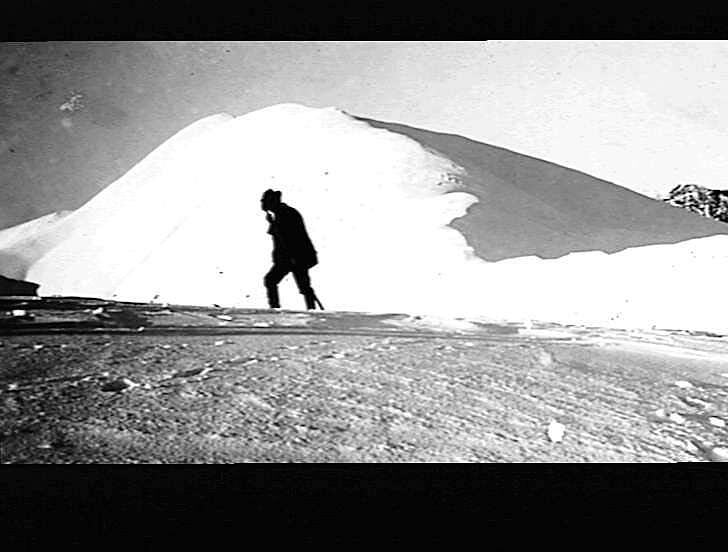 Distant view of Mount Feathertop. Man with pole moving up slope in foreground.