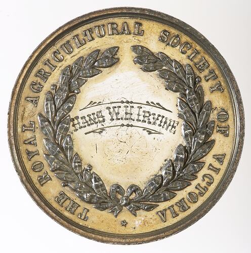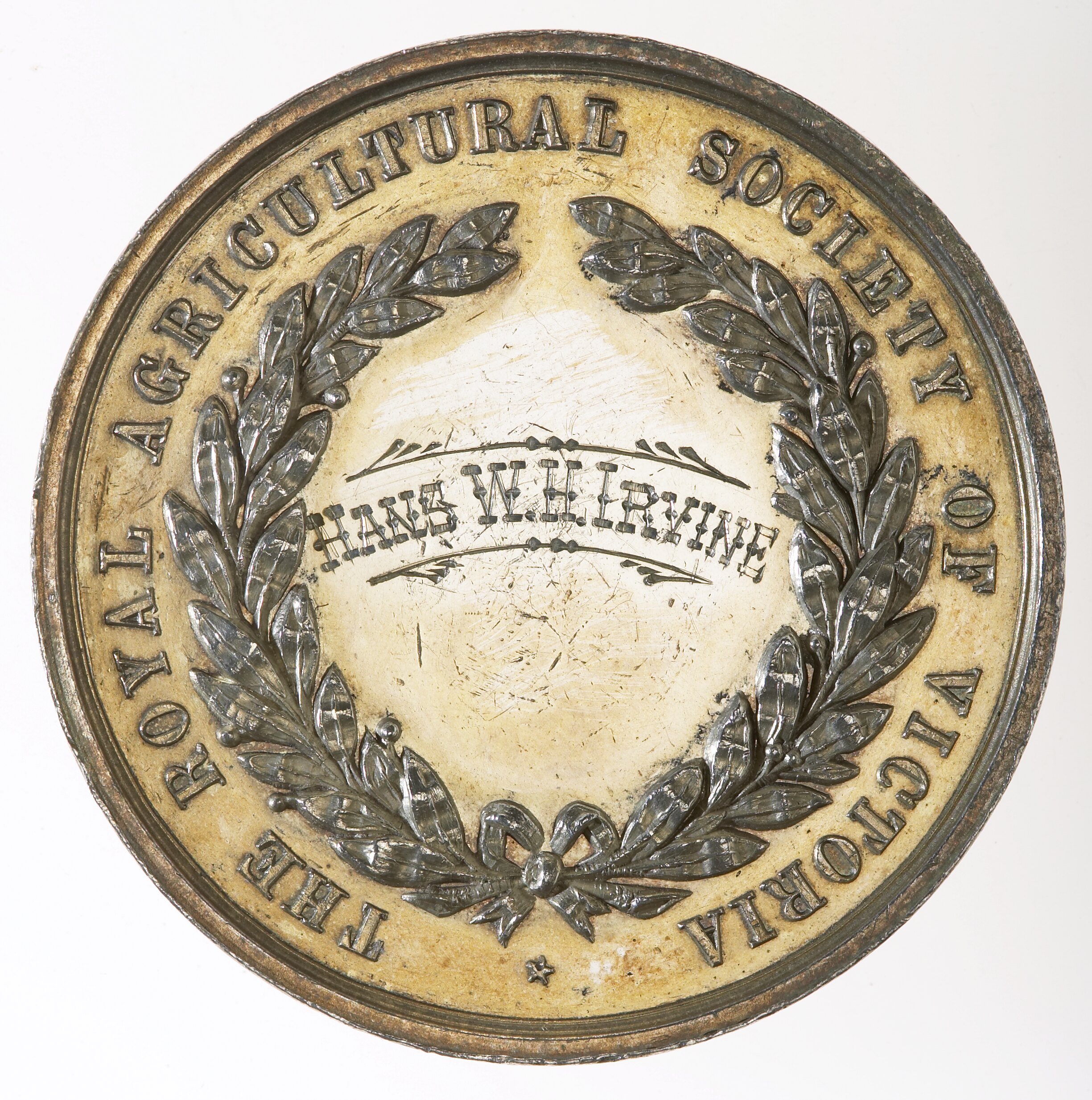 At centre inscribed within an olive wreath, HANS W.H. IRVINE; around, THE ROYAL AGRICULTURAL SOCIETY OF VICTORIA