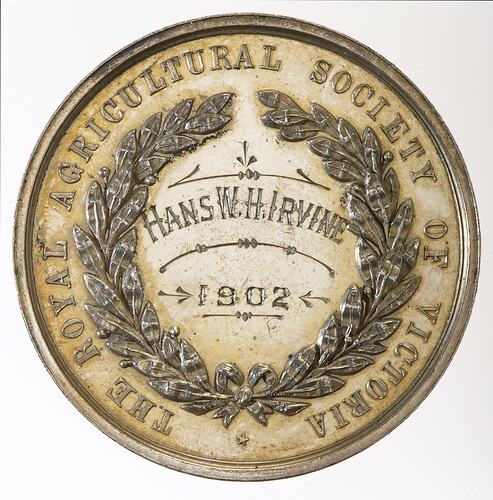 At centre inscribed within an olive wreath, HANS W.H.IRVINE 1902 ; around, THE ROYAL AGRICULTURAL SOCIETY OF VICTORIA