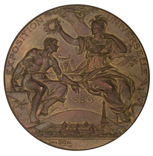 Obverse: EXPOSITION UNIVERSELLE 1889; and the artist's name Louis Bottee Reverse: REPUBLIQUE FRANCAISE; HANS IRVINE. and the artist's name Louis Bottee Edge: Stamped BRONZE