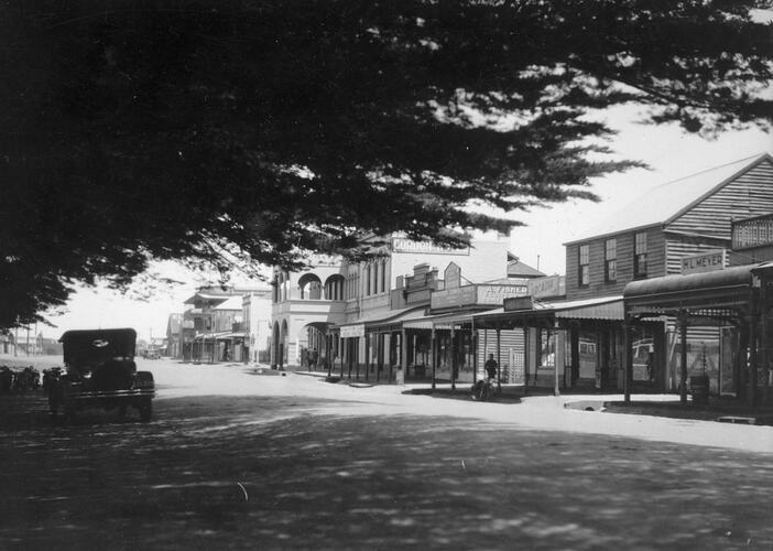 Advertising, Bicycles, Cycling, Motor Cars, Shops, Streetscapes, Trees, Verandahs