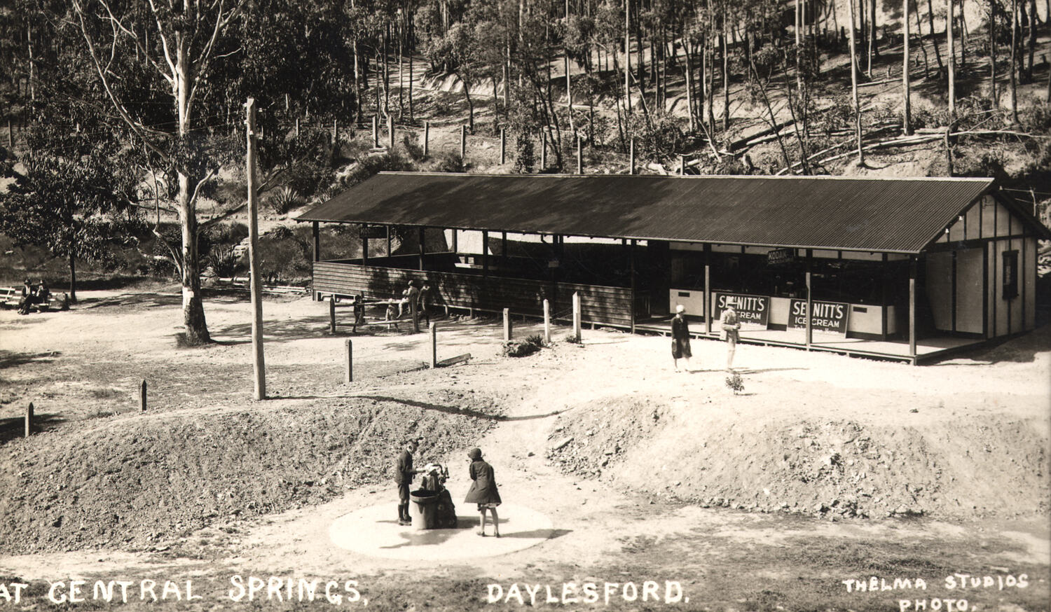 Central Springs sign on building advertising Sennetts Icecream and Kodak two persons obtaining their mineral water.
