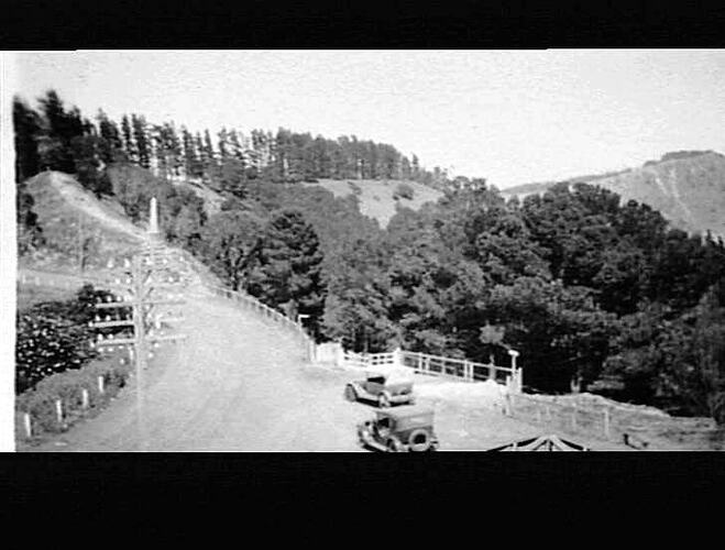 Motor cars travelling down a road.