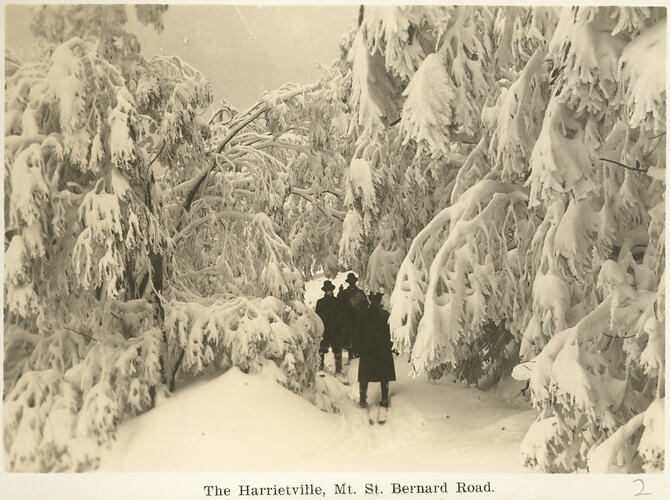 Harrietville , Mt St Bernard road. With three men walking through snow. (a second copy, with caption 'Harrietville to Hospice in winter' appears at cn 17).
