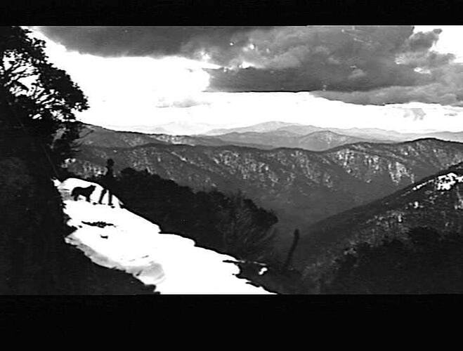 The Ovens Valley, Mt Blowhard. Man and dog standing in snow at left.