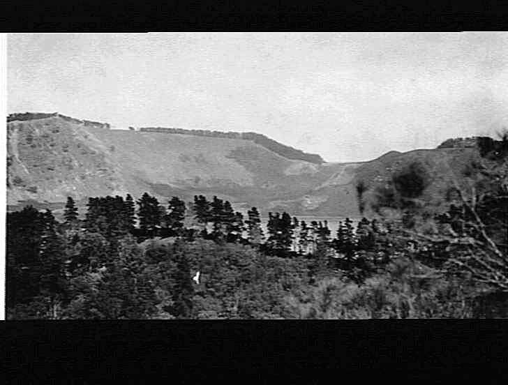 View of crater lake with conifer forest in foreground. Probably Brown Lake or Blue Lake at Mount Gambier, South Australia.