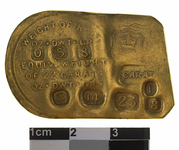 Obverse: WEIGHT OF INGOT / OZ.DWT.GR / 0 5 8 / EQUIV.WEIGHT / OF 22 CARATS / OZ.DWT.GRS / 5 14; [Crown] S.A / CARAT / 23 1 8 Reverse: ELECTRO