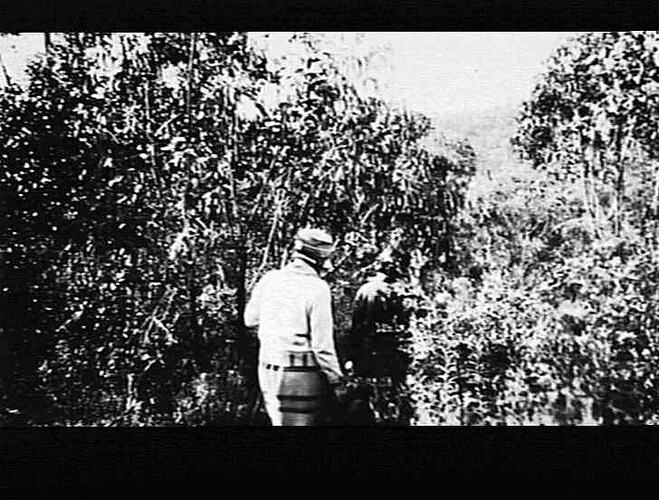 Women walking through trees.