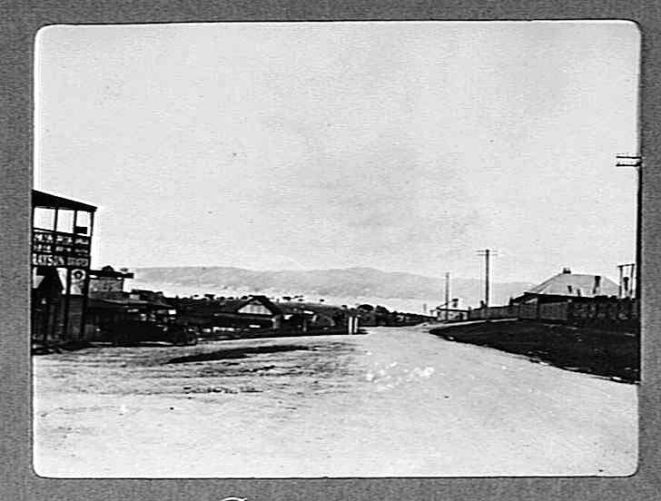 Advertising, Drapers, Horsedrawn Vehicles, Horses, Motor Trucks, Power Lines, Roads, Shops, Streetscapes