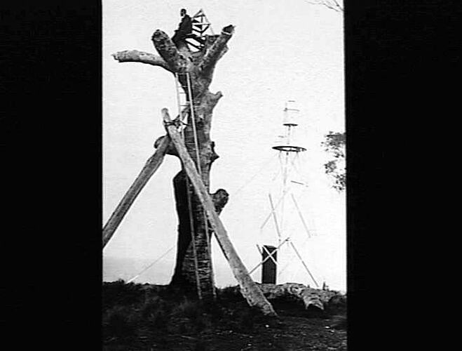 Ladder is leaning against tree and man has climbed it and perched himself on top of tree.