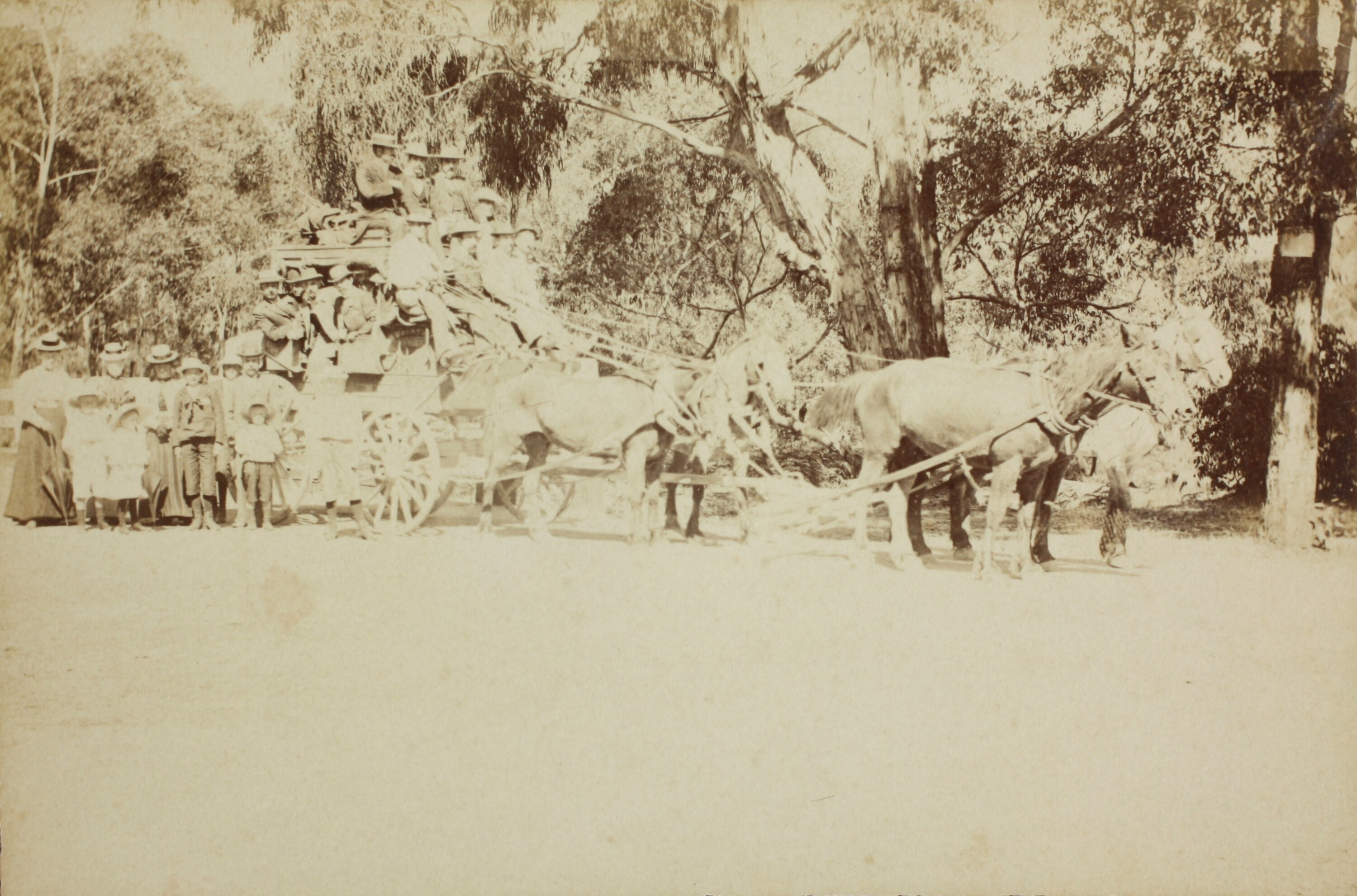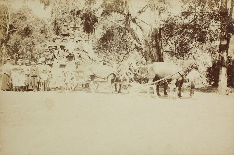 Black and white image of W. Mountjoy's horse drawn coach, with people sitting on roof of coach and inside coach. It was taken at Erskine River, Lorne, Victoria in the 1890s.