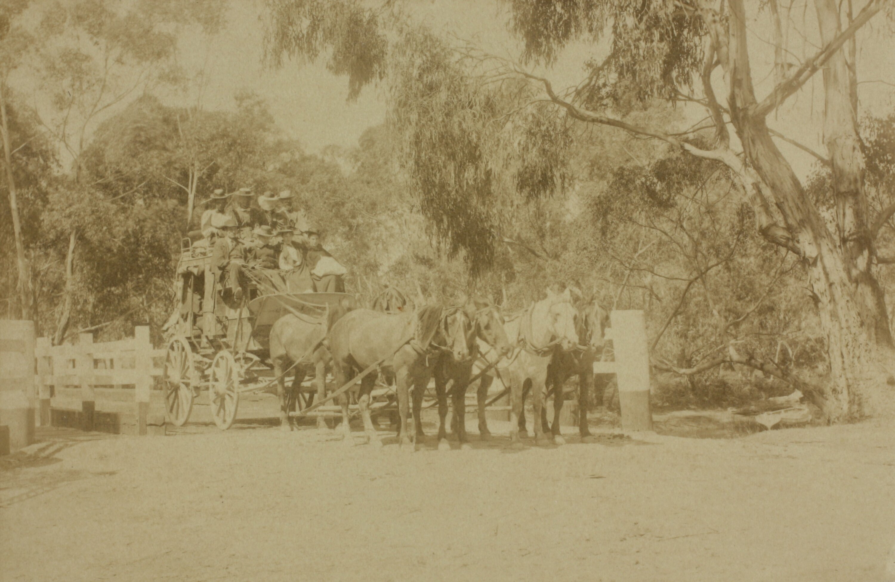 Black and white image of W. Mountjoy's horse drawn coach, with people sitting on roof of coach and inside coach. It was taken at Erskine River, Lorne, Victoria in the 1890s.